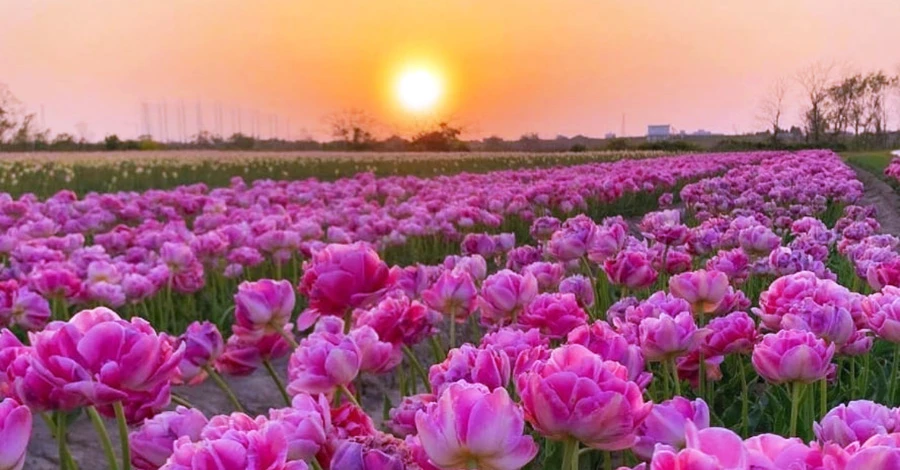 This is a large flower field of 6 hectares, planted with millions of tulips of various varieties and colors. Primarily, Dutch varieties are planted here, and the flowers grow in neat rows, creating a beautiful geometric pattern.