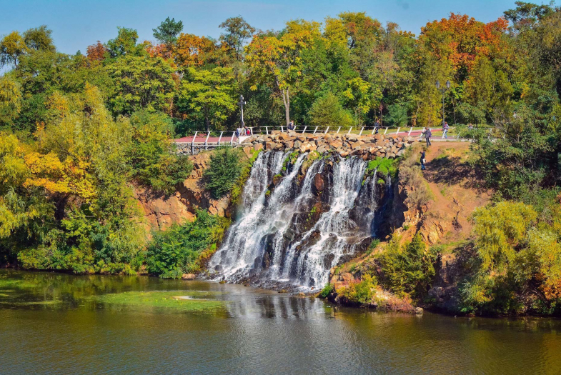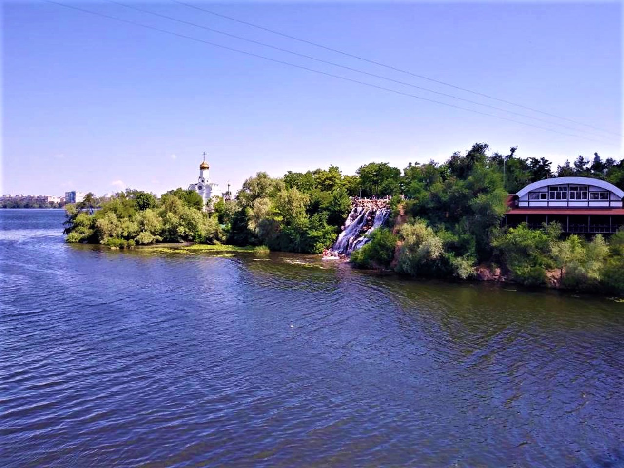 The modern "Roaring Threshold" on Monastery Island is a restored reminder in the urban space of one of the true Dnipro rapids that disappeared after the launch of the Zaporizhzhia Hydro Power Plant. The waterfall was opened in 2013: water cascades down from a height of approximately 17 meters over a natural stone slope, creating a wide cascade that is visible from various points along the embankment.