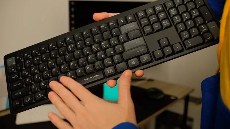 Короткий хід ножичного механізму дозволяє здійснювати набір великих обсягів тексту — руки менше втомлюються, пальці легко ковзають по поверхні, а завершення натискання відчувається як м’яке приземлення без чітко вираженого клацання. Для тих, хто звик до ноутбучних клавіатур, період адаптації буде практично непомітним — ви не відчуєте жодної різниці. Набирати тексти на таких клавіатурах — справжня насолода.