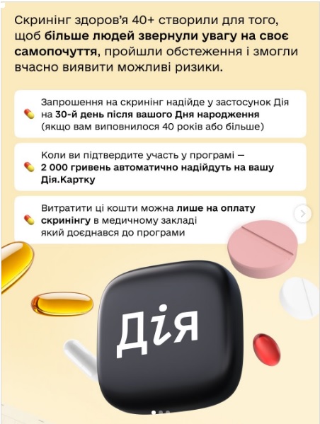 Програма спрямована на раннє виявлення хронічних захворювань, таких як діабет, серцево-судинні хвороби та порушення ментального здоров’я. Кожен учасник отримає 2000 гривень на «Дія.Картку» для проходження медичного скринінгу.