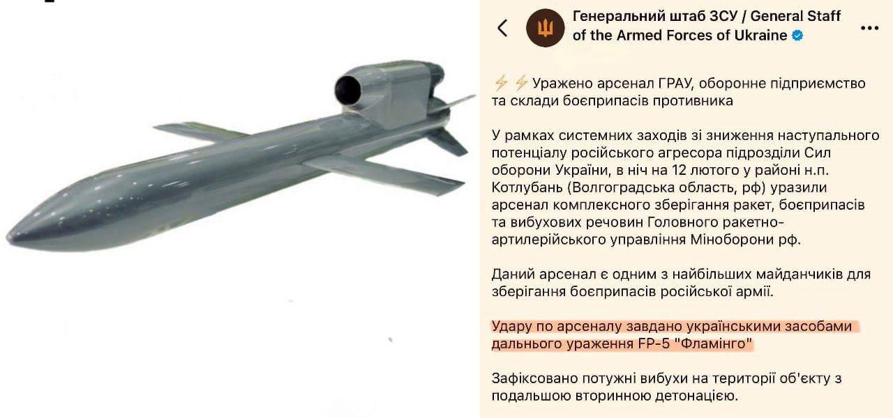 У ніч на 12 лютого в Волгоградській області Росії було завдано удару по арсеналу Міністерства оборони РФ, розташованому поблизу селища Котлубань. Про це повідомив Генеральний штаб Збройних Сил України.